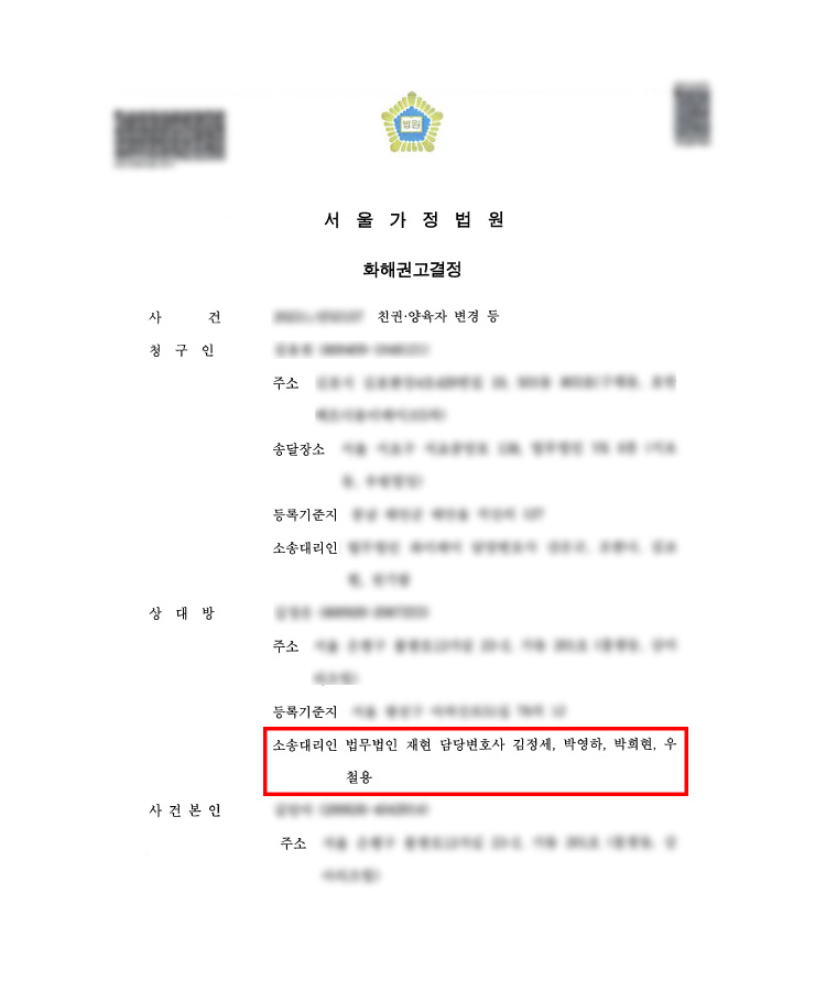 사건내용 의뢰인의 아이를 양육하고 있던 중 배우자로부터 양육권, 친권자 변경 및 양육비 청구를 받았습니다. 아이를 양육하고 싶은 것은 맞지만 현실적인 어려움이 있었고, 양육비를 지급하는 것도 어려운 상황이라 문제의 해결을 원하셨습니다. 재현의 조력 상대방은 아이 양육자로 본인이 지정되는 이상 양육비 지급은 당연한 것임을 주장하였고 이는 법리적으로는 타당한 주장이었습니다. 허나 이미 의뢰인이 아이를 양육하고 있기에 양육자변경은 의뢰인의 동의 없이 이루어지기는 어려운 상황임을 근거로 상대방과 협상을 하였고, 양육비는 모두 포기하는 것으로 합의하였습니다. |