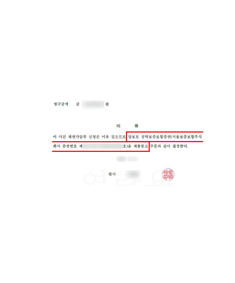 사건내용 의뢰인은 배우자의 외도를 알게되어 이혼을 결심하셨습니다. 유일한 재산인 전세보증금이 배우자 명의로 되어 있었으므로, 재산과 위자료를 확보하기 위해 이혼 소송과 동시에 전세금가압류 진행하였습니다. 전업주부다보니 가진 재산이 전혀 없어 가압류 진행에 필요한 공탁금이 없어 곤란한 상황이었습니다. 재현의 조력 재현은 배우자의 외도사실을 충분히 입증하였으며, 전세금을 언제든 회수할 수 있는 가능성이 있으므로 신속한 가압류의 필요성을 주장하였습니다. 재산분할에 대한 기여도도 40%이상을 주장하고 주장을 뒷받침할 근거를 충분히 제시하였습니다. |