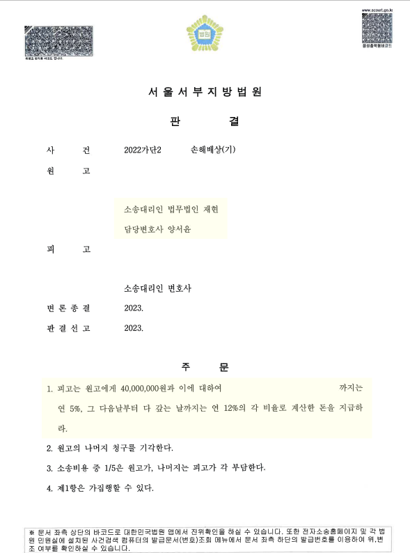 사건내용 의뢰인께서는 배우자의 부정행위를 알게 된 후 상간자에 대한 책임을 묻고자 위자료청구소송을 의뢰하였습니다. 재현의 조력 법무법인 재현에서는 상간자를 상대로 일반적인 상간자 소송에서 청구하는 금액보다 높은 5천만 원의 위자료를 청구하면서, 이 사건 부정행위로 인하여 의뢰인이 극심한 정신적 고통을 받고 있다는 점에 대한 여러 근거를 제시하였습니다. 법원은 우리의 주장을 받아들여 상간녀의 부정행위를 모두 인정하였고, 일반적으로 인정되는 위자료 액수보다 훨씬 높은 4,000만 원의 위자료 및 연 12%의 지연이자를 지급하라는 판결을 내렸습니다. 이후 의뢰인은 어린 자녀를 생각하여 가정을 유지하기로 하였습니다. |